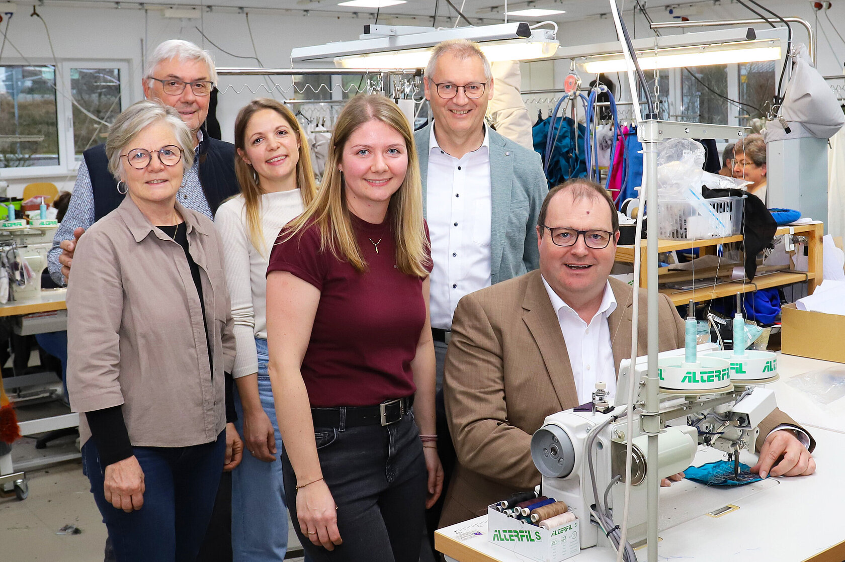 Bei einem Rundgang durch die Schneiderei, bei dem sozusagen der Weg eines Kleidungsstücks verfolgt wurde, wurde es dann ernst für Landrat Michael Fahmüller. Er durfte an einer Nähmaschine Hand anlegen. „Das ist schon sehr beeindruckend, wenn man das Schnittmuster, eine bloße Zeichnung, sieht und daraus dann wunderschöne Abendkleider und vieles mehr entstehen“, so der Landrat. „Da wird einem erst mal wieder bewusst, wie viel Arbeit und vor allem Handwerk dahintersteckt. Dieser Gedanke kommt heutzutage leider oftmals zu kurz, wenn man im Geschäft ein Kleidungsstück von der Stange nimmt.“