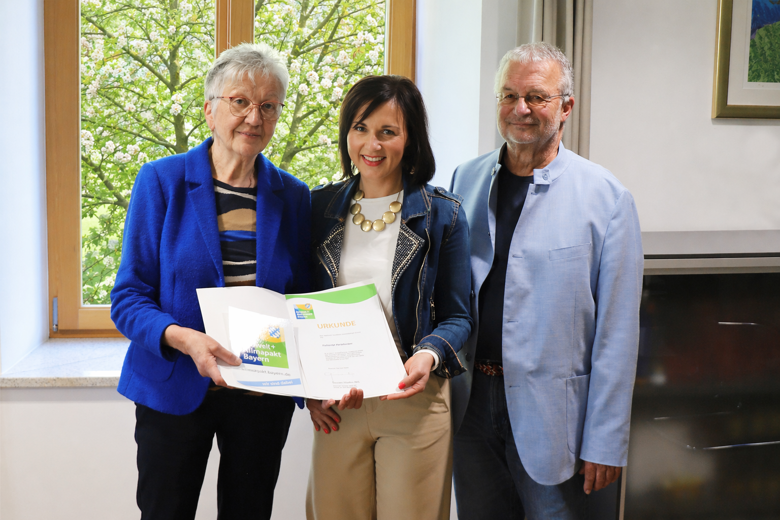 Inhaberin Romy Dadlhuber betonte, dass auch die Hotelgäste die Maßnahmen zu schätzen wissen, etwa die E-Ladesäule vorm Haus, die mit eigenem Strom betrieben wird oder dass beim Frühstück gänzlich auf Plastikverpackungen verzichtet wird. „Daher freuen wir uns, dass unser Hotel nun die Urkunde am Umwelt und Klimapakt Bayern erhalten hat und unsere Überzeugungen und unser Einsatz noch mehr Sichtbarkeit erlangen“, so Dadlhuber.