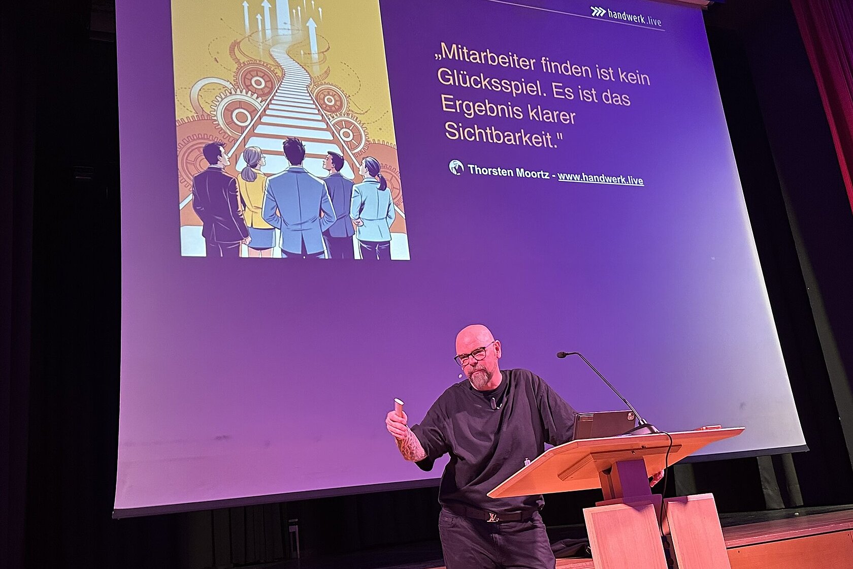 Im Mittelpunkt des Abends stand der Vortrag von Thorsten Moortz. Der Speaker, Trainer und Unternehmer zeigte unter dem Titel „Kunden- und Mitarbeitergewinnung mit Hilfe von TikTok, Instagram und Co.“, wie kleine und mittlere Betriebe Künstliche Intelligenz und soziale Medien gezielt und mit überschaubarem Aufwand einsetzen können. Anhand konkreter Beispiele machte er deutlich, wie Unternehmen sichtbar werden, ihre Arbeitgebermarke stärken und sowohl Kundinnen und Kunden als auch Auszubildende und Fachkräfte ansprechen können. Dabei sprach er nicht nur theoretisch über Chancen und Risiken, sondern führte auch auf der Leinwand ganz konkret und praktisch vor, wie bspw. ChatGPT und weitere Tools genutzt werden können, um passende Social Media-Posts zur Mitarbeitergewinnung zu generieren. Sein Credo: „Nicht von der KI machen lassen, aber mit Hilfe der KI.“  Im anschließenden Q&A griff Moortz zahlreiche Fragen aus dem Publikum auf und ging auf die individuellen Herausforderungen der Betriebe ein.