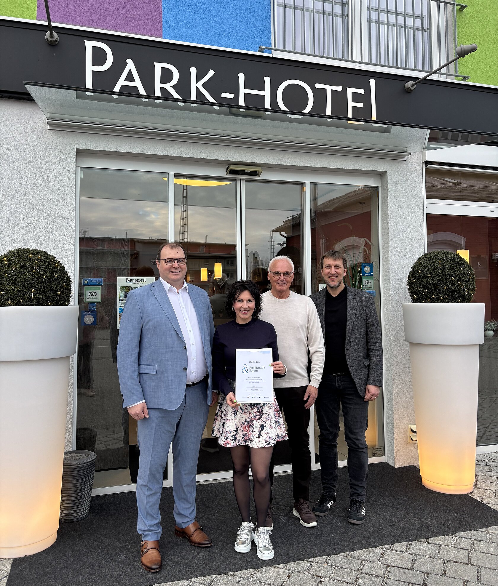 Mit im Gepäck hatte Landrat Michael Fahmüller auch die Urkunde für die Mitgliedschaft des Parkhotels am „Familienpakt Bayern“. „Das Parkhotel Pfarrkirchen ist nun dem Familienpakt Bayern beigetreten und bringt damit zum Ausdruck, dass sie sich in ihrem Arbeitsalltag für eine familienbewusste Personalpolitik einsetzen“, erläutert der Landrat. „Dass unsere Angestellten zum Teil schon viele Jahre lang bei uns arbeiten, zeigt, dass wir bei der Vereinbarkeit von Familie und Beruf vermutlich vieles ohnehin schon richtig machen“, erklärt Romy Dadlhuber. „Gerade Frauen, die bei uns arbeiten, schätzen es, dass man in Notfällen das Kind auch mal mitnehmen darf oder man im Falle fehlender Kinderbetreuung Schichten flexibel tauschen könnte.“ Besonders wichtig sei auch eine langfristige Planung der Dienstpläne. „Auch das sorgt dafür, dass wir gerade bei Angestellten mit Kindern Termine und private Ereignisse berücksichtigen können“, so Dadlhuber, die überzeugt ist, dass es immer auch ein Miteinander ist. „Das ist ein Geben und Nehmen. Und da ich selbst Familienmensch durch und durch bin, ist es mir ein Anliegen, dass sich Familie und Beruf bestmöglich vereinbaren lassen. Umso mehr freut es uns, dass wir nun Mitglied im Familienpakt Bayern sind.“ „Auch unser Landkreis profitiert davon, wenn sich Betriebe diesem Netzwerk anschließen – für starke Familien, motivierte Mitarbeitende und eine zukunftsfähige Wirtschaftsregion. Daher meinen Glückwunsch und weiterhin alles Gute“, so der Landrat.