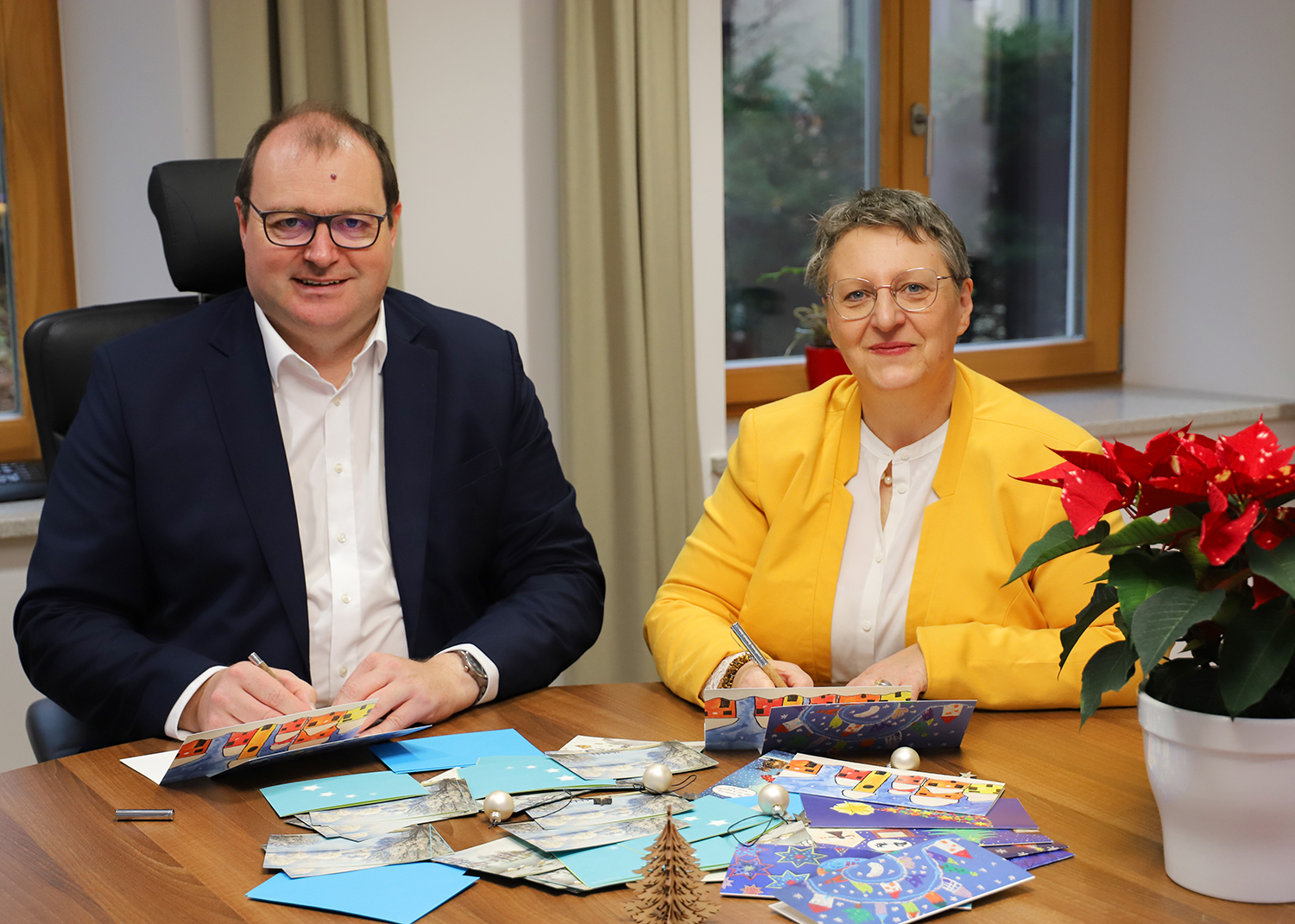 Auf dem Bild: Landrat Michael Fahmüller und die Seniorenbeauftragte Ursula Müller beteiligen sich ebenfalls mit eigenen Weihnachtskarten an der Aktion „Weihnachtspost mit Herz“.