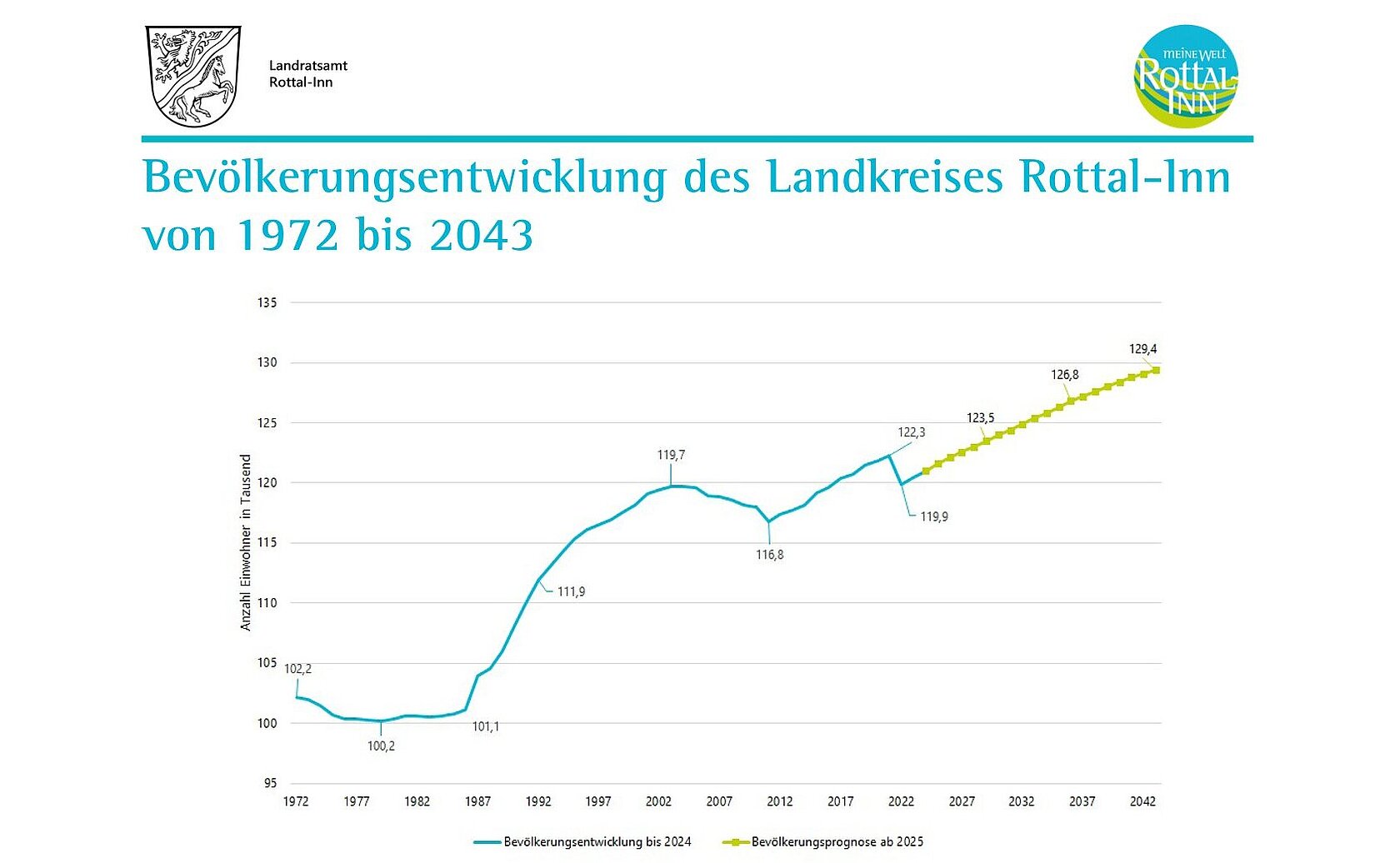 Die Bevölkerung des Landkreises Rottal-Inn ist in den letzten Jahrzehnten deutlich gewachsen. Auch künftig soll die Bevölkerungszahl weiter zunehmen: Von aktuell rund 120.500 Personen wird diese bis 2043 voraussichtlich auf etwa 129.400 steigen.