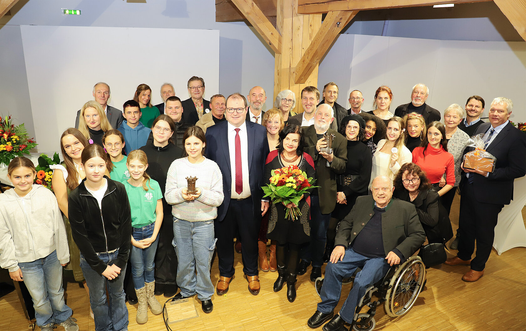 Die Kulturpreisträger 2025 (v. l.): die Schülerinnen und Schüler der Nachmittagstheatergruppe der Realschule Pfarrkirchen (Nachwuchskulturpreis), die Mitglieder des Bauhoftheaters Braunau (Kulturpreis) und die Gemeinde Egglham in Person von Bürgermeister Hermann Etzel (Baukulturpreis). Mit ihnen freut sich Landrat Michael Fahmüller (vorne mittig). Ebenfalls auf dem Bild sind Pfarrkirchens Erster Bürgermeister und Hausherr Wolfgang Beißmann sowie der Kulturbeauftragte des Landkreises Dr. Ludger Drost.